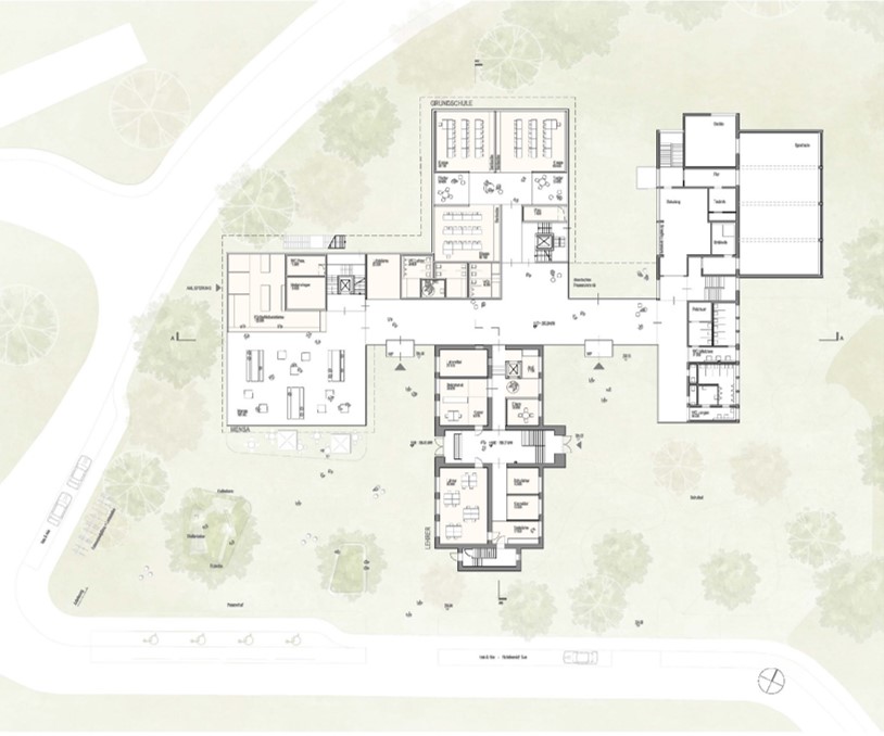 Die Aufgabenstellung an Planer ist der Erhalt und Umbau des „Altbaus“ und den Erweiterungsbau im gestalterischem und funktionalem Bezug anzubinden. Die Stellung des Erweiterungsbaues hat die bestehenden Freiflächen des bestehenden Schulhofes zu berücksichtigen.